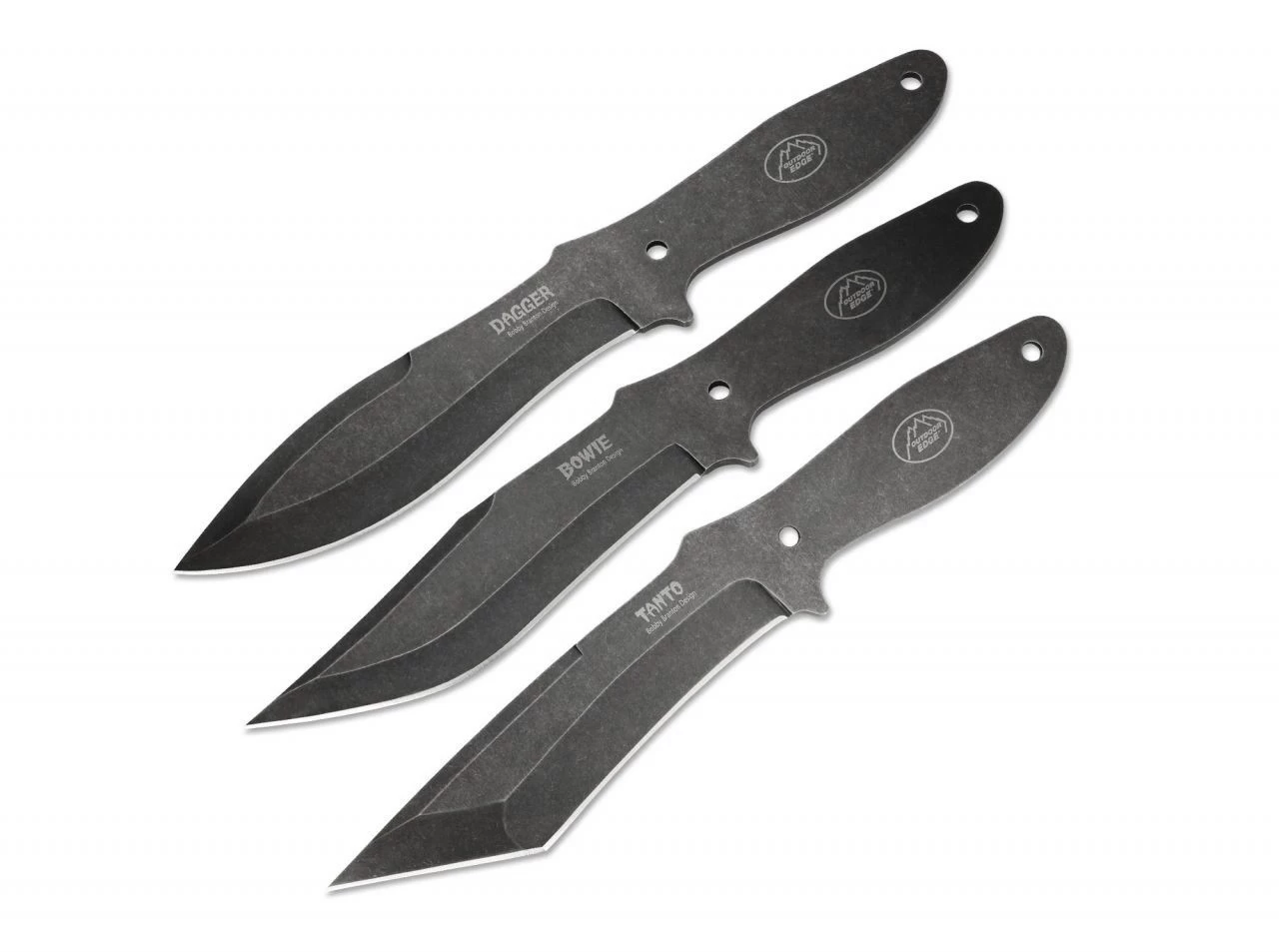In Zusammenarbeit mit dem bekannten Profi-Messerwerfer Bobby Branton wurde dieses Set entwickelt, dessen Messer mit Tanto-, Spearpoint- und Bowieklinge trotz der unterschiedlichen Bauform exakt identisch ausbalanciert sind und identische Flugeigenschaften besitzen. Blackstone-Beschichtung, Klingenstahl 420J. Durch die Bohrungen im Erl können die Messer auch mit einer Paracord-Wicklung versehen werden. Lieferung mit Nylonscheide.