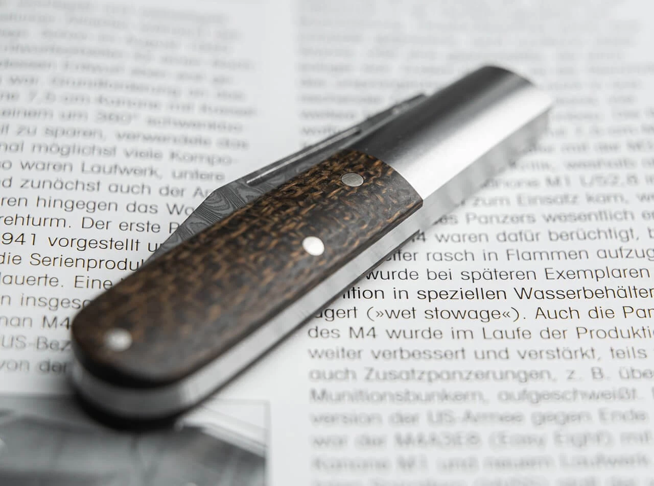 Die weltweite Begeisterung für unser einzigartiges Böker M4 Sherman-Damast hat uns schnell davon überzeugt, auch ein klassisches Modell mit dem geschichtsträchtigen Damaststahl zu entwerfen. Das traditionelle Böker Barlow ist im Vergleich zum Ursprungsmodell deutlich kompakter und macht nicht nur in der Messer-Vitrine eine besonders gute Figur, sondern überzeugt als hosentaschentaugliches Gentlemanmesser auch im Alltag. Die Klinge besteht aus dem unvergleichlichen Sherman-Damast, wird per Nagelhau geöffnet und verriegelt nicht. Die Bediensicherheit des geschichtsträchtigen Slipjoint-Taschenmessers wird durch eine 90 Grad Rastung beim Öffnen und Schließen zusätzlich erhöht. Die auffällige Tropfenform des Barlow lässt sich bis zu den englischen Taschenmessern des 17. Jahrhunderts zurückverfolgen, womit es sicherlich zu den ältesten Modellen überhaupt zählt. Der Name des Klassikers geht wahrscheinlich auf einen gleichnamigen, geschäftstüchtigen Messerproduzenten aus Sheffield zurück, der um 1800 begann, die robusten Messer nach Nordamerika zu exportieren. Dort erfreuten sie sich auf Anhieb sehr großer Beliebtheit und so erschienen zum Ende des 19. Jahrhunderts auch in der Historie der Böker Manufaktur die ersten Barlow Modelle.