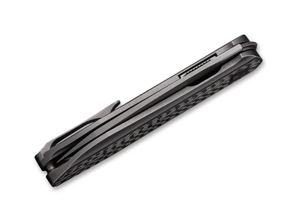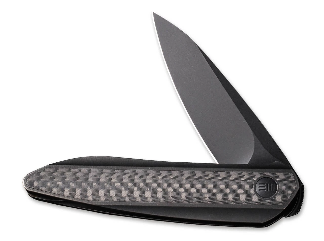 Das elegante WE Knife Black Void wartet mit klarer Formensprache und einem edlen Materialmix auf. Während die schwarze Klinge aus pulvermetallurgischem CPM-20 CV Souveränität ausstrahlt, überzeugt der Titangriff mit Schalen aus Kohlefaser durch seine sichere Handhabung. Geöffnet wird das Messer mit dem eleganten Flipper und gesichert wird die kugelgelagerte Klinge per Linerlock. Mit Titanclip (Tip-up/r).