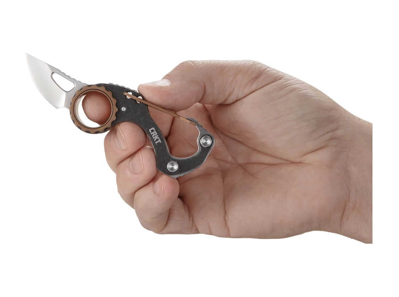 Mit dem CRKT Compano ist Designer Mike Bond ein außergewöhnlicher Wurf gelungen. Das Slipjoint-Messer mit 5Cr15MoV Klinge fällt insbesondere durch seinen Edelstahlgriff im Black Stonewash-Finish auf, der gleichzeitig als Karabiner genutzt werden kann. Farbliche Akzente setzen das in Bronze gehaltenen Klingendrehgelenk und der Schnapper.