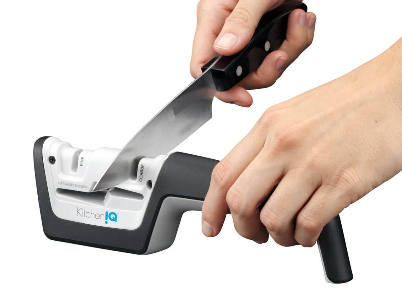 Der DP2S von KitchenIQ bietet eine grobe Vorstufe mit Diamantelementen, die die Schneiden klassischer europäischer Küchenmesser im Winkel von 35° abziehen, während die Feinabzugsstufe mit dreieckigen Keramik-Elementen im Winkel von 37° nicht nur den Feinabzug erledigt, sondern auch für Wellenschliffe geeignet ist. Die Scherenschärfer arbeiten mit schwimmend gelagerten Ceramicelementen und schärfen Linkshänderscheren ebenso wie solche für Rechtshänder. Gummifüße für sichere Handhabung.