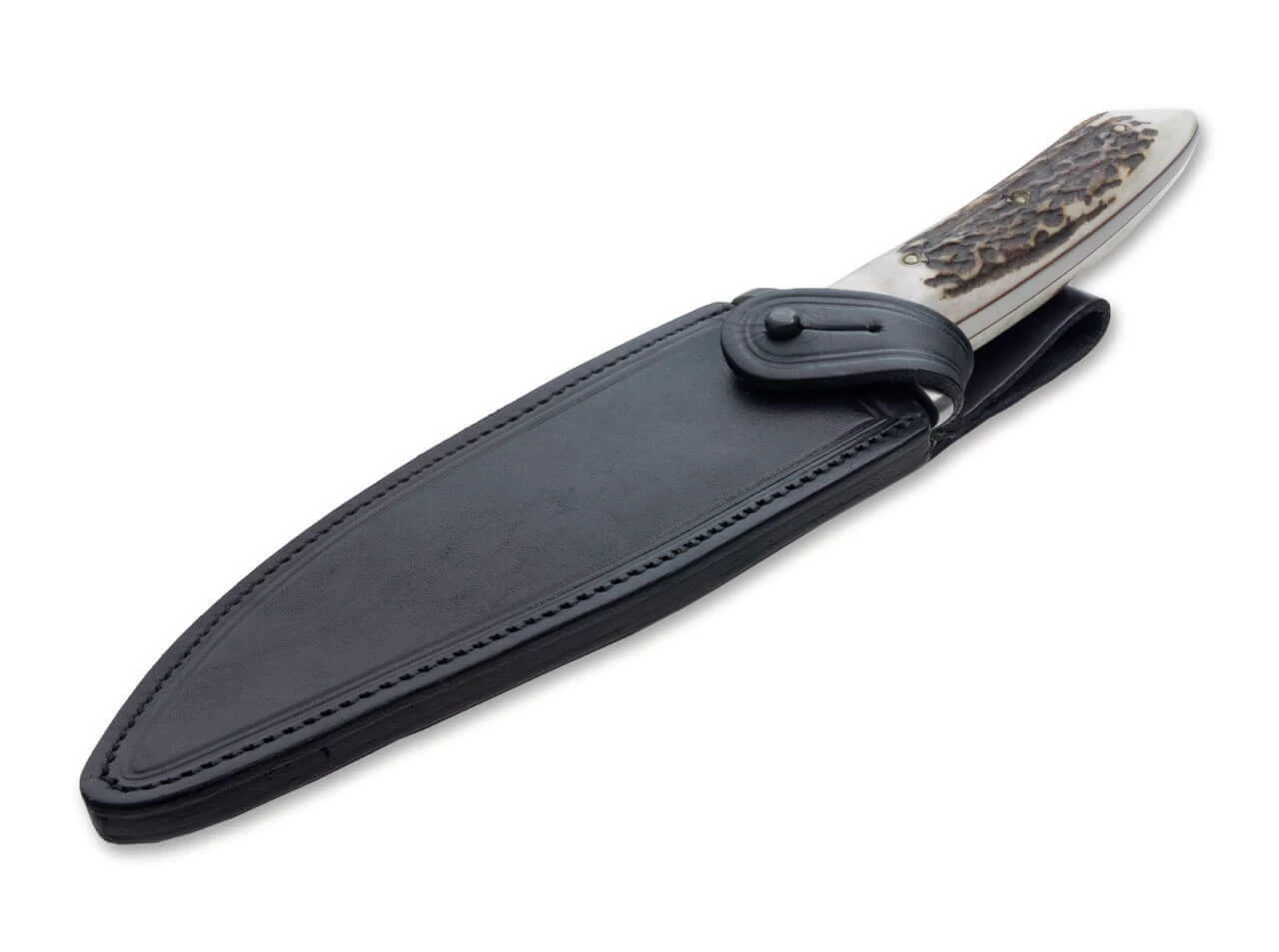 Die massive Bauweise in Kombination mit der klassischen Optik und dem hohen Gebrauchswert machen das Böker Arbolito Esculta, die kompaktere Version des El Gigante, zu einem ausgezeichneten Begleiter für Outdoor und Jagd. Die traditionellen Griffschalen werden aus handverlesenem Hirschhorn gefertigt. Die klassischeAnmutung des Materials im Zusammenspiel mit dem überaus praxistauglichen Stonewash-Finish machen das Bowie zu einem außergewöhnlichen Messer nicht nur für den Einsatz, sondern auch für den Sammler. Die massive Klinge aus Böhler N695–Stahl läuft komplett durch den Griff und verjüngt sich zum Griffabschluss. Der sogenannte Tapered Tang verleiht dem Messer eine besondere optische Note und balanciert es optimal aus. Der ausladende und kräftige Handschutz aus gebürstetem Edelstahl verspricht hohe Arbeitssicherheit und trägt zum edlen Erscheinungsbild bei. Lieferung mit hochwertiger Lederscheide.