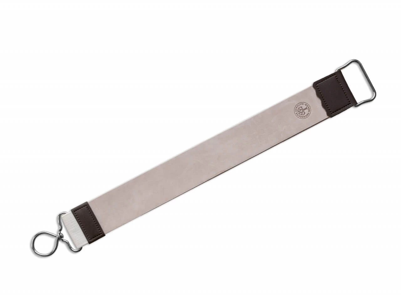 Böker Abziehriemen für Rasiermesser, aus bestem Rindleder und mit vernickelten Stahlösen zum Aufhängen und Halten. Die Rückseite aus Leinen nimmt vor dem Ledern Schmutz und lose Stahlpartikel auf. Inklusive authentischer Böker-Prägung. Auslieferung inklusive Leder-Pflegepaste. Arbeitsfläche: 4,5 x 30 cm