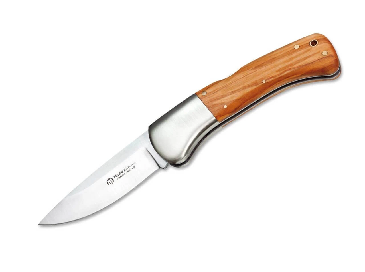 Dieses ausgewachsene Jagd- und Outdoortaschenmesser ist auch für den derberen Einsatz geeignet und bietet mit seinen Neusilberbacken, den sanft gerundeten Olivenholzschalen und der satinierten Klinge aus 440 Eleganz und Nutzwert. Backlock-Verriegelung.