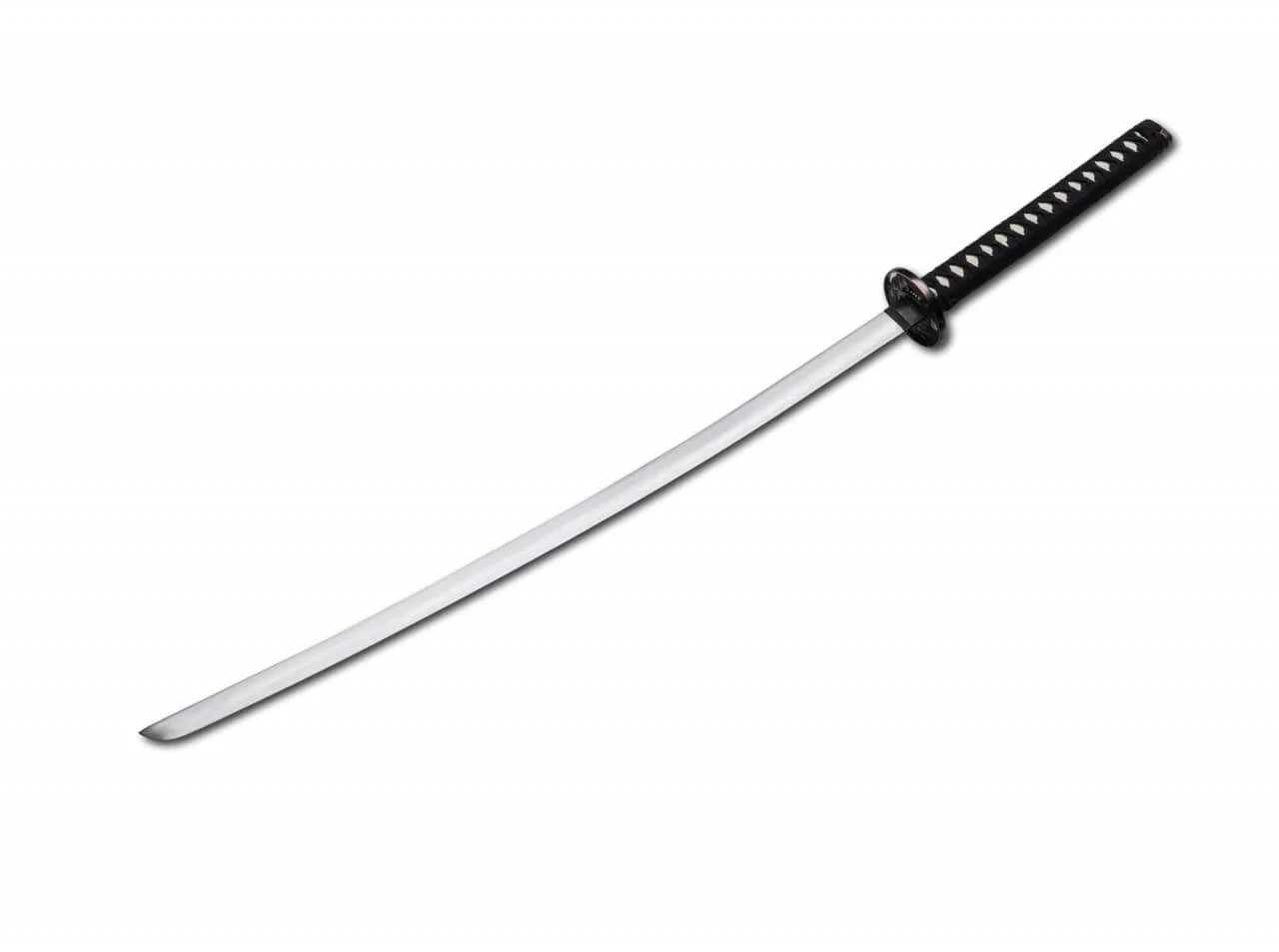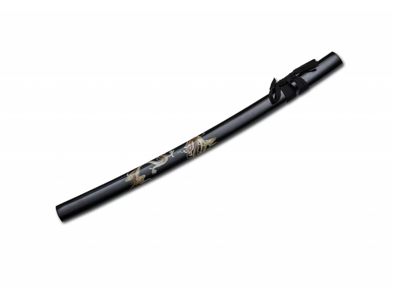 Eine der Neuheiten in unserem Schwerter- Portfolio verfügt über eine dekorativ geschliffene Klinge aus Karbonstahl (nicht rostfrei) und eine traditionelle Tsuba. Ein fliegender Drache ist das Motiv des Stichblatts. Der traditionell anmutende Griff besitzt eine Griffunterlage aus Rochenhaut-Imitat und die typische Griffwicklung. Die Härtelinie (Hamon) ist künstlich aufgebracht. Schwarze Holzscheide mit einem bernsteinfarbenen Drachen. Deko- bzw. Sammlerschwert, nicht zum Einsatz geeignet!