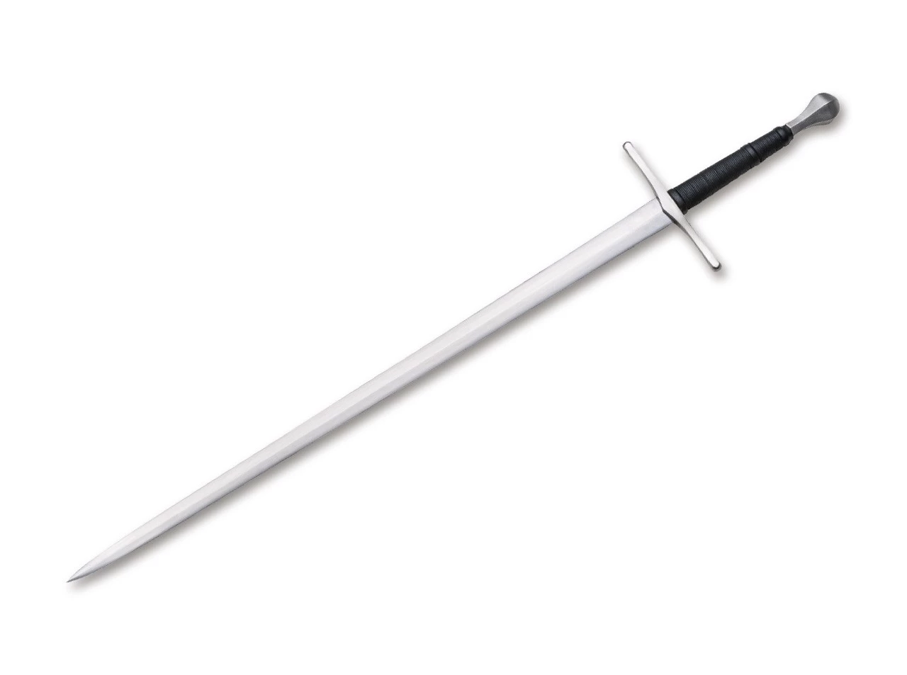 Die gehärtete und abgezogene Klinge dieses einsatztauglichen Schwertes ist flexibel wie sein historisches Vorbild und wird mit viel Liebe zum Detail mit hochwertigem Griff und Edelstahlbeschlägen versehen, so dass das Schwert durch seine Ausgewogenheit und die äußerst edle Anmutung begeistert. Die Authentizität dieser edlen Blankwaffe fasziniert auf Anhieb, und die hochwertige Verarbeitung eines jeden Exemplares macht das Mittelalter wieder lebendig. Ausgeliefert wird das Two Handed Sword mit sauber angepassten authentischen Scheide mit Edelstahlbeschlag. Man muss ein Schwert nicht unbedingt aus einem Stein ziehen, um sich wie ein König zu fühlen! Dieses faszinierende Langschwert beeindruckt nicht nur durch die imposanten Abmaße. Die Balance, die Ausführung des mit Leder und Kordel umwickelten Griffes und die dekorativ abgezogene Klinge aus 1060er Kohlenstoffstahl sind nur einige Features, die das Schwert zu einem Highlight jeder Sammlung machen. Der Mittelgrat lässt den Zweihänder filigran und ausgewogen wirken.