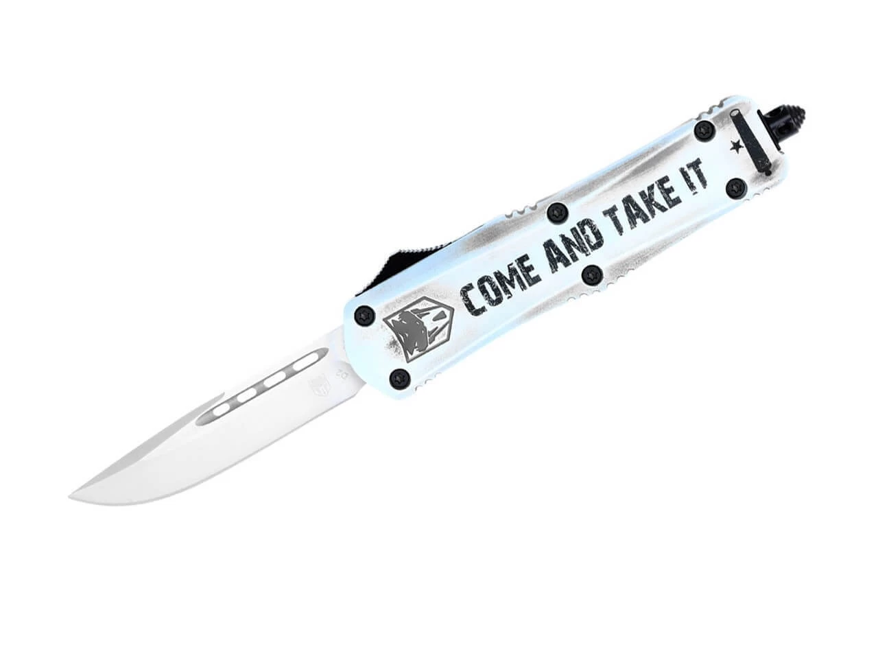 Die mittelgroße Variante des beliebten FS-3 überzeugt mit einer soliden D2 Drop Point Klinge, die pfeilschnell per Knopfdruck aus dem vorderen Griffstück kommt und bei erneutem Betätigen wieder dort verschwindet. Das OTF Messer (Out The Front) ist mit einem texturierten Griff aus hochfestem Aluminium versehen, der den Schriftzug „Come and take it“ sowie einen schwarzen Stern trägt. Der Deep-Carry Clip ist am Glasbrecher befestigt und erlaubt eine beidseitige Tip-Up Trageweise. Lieferung mit hochwertigem Nylon Etui.