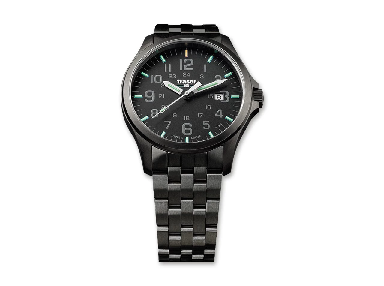Die P67 ist mit anti-reflektierendem Saphirglas ausgestattet und hat einen Gehäusedurchmesser von 42 Millimetern. Im PVD-beschichteten Edelstahl-Gehäuse befindet sich ein Swiss Made Quarz Uhrwerk. Die grauen Ziffern und Uhrzeiger sitzen auf einem schwarzen Ziffernblatt. Das Stahl-Armband ist angenehm zu tragen. Die Uhr ist wasserdicht bis 10 bar oder 100 Meter. Die trigalight Selbstleuchttechnologie erleuchtet Index 1 bis 11 in grüner Farbe und die Index 12 in orangener Farbe.