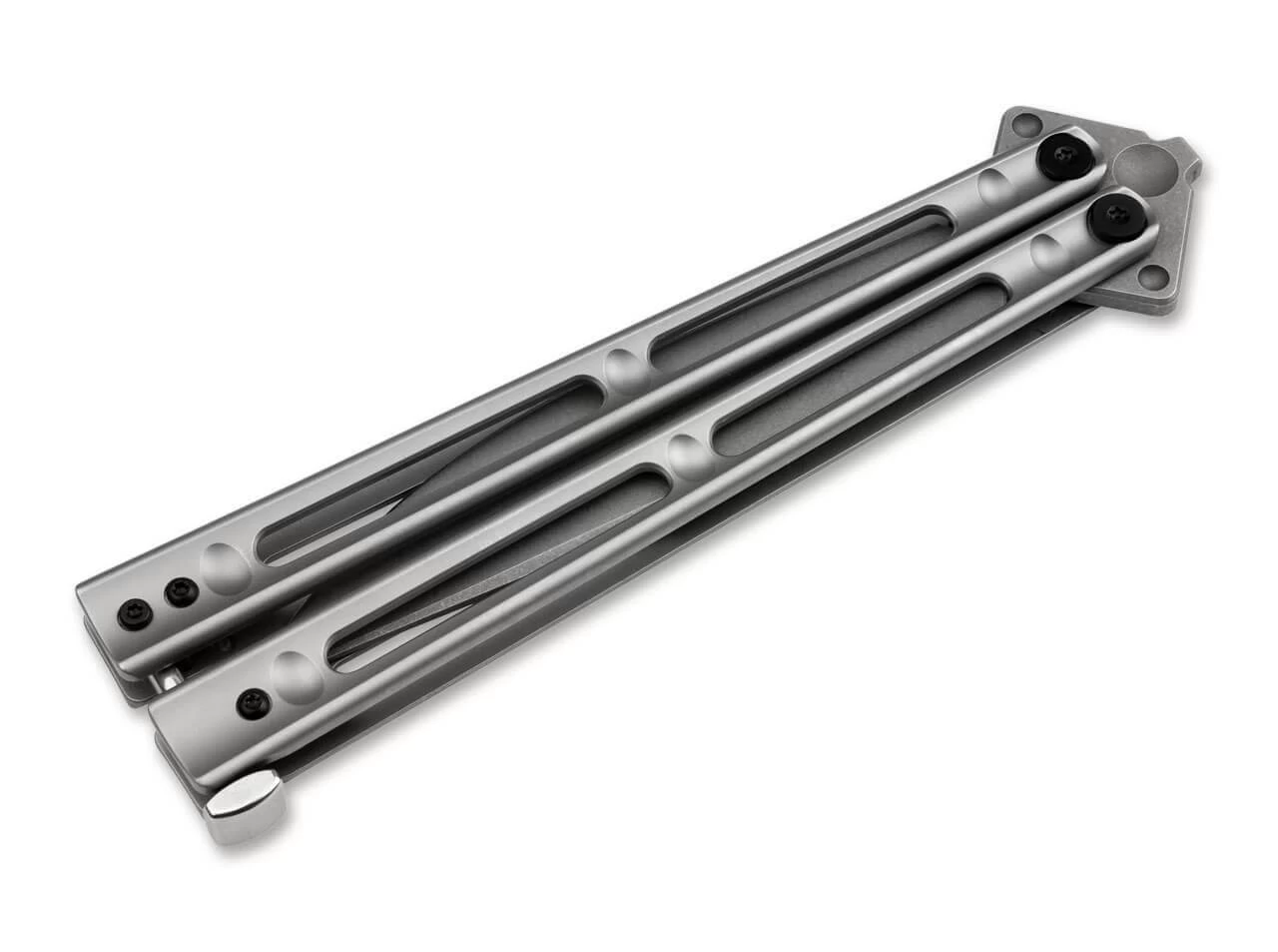 Das Böker Plus Papillon ist ein ausgewachsenes Balisong mit skelettierten Edelstahl-Griffhälften, die mit einem matten Beadblast-Finish versehen sind. Das auch als Butterfly-Messer bekannte Balisong verdankt seinen Namen dem einfachen Faltmechanismus des geteilten Griffs, der deutlich weniger anfällig für Verschmutzungen ist als andere Mechanismen. Die kugelgelagerte Clippoint-Klinge wird aus D2 gefertigt und ist mit einem ebenfalls matten Stonewash-Finish versehen. Die ausgeprägte Fehlschärfe unterstreicht den taktischen Charakter des Messers. Mit hochwertigem Nylon-Etui zur Aufbewahrung..