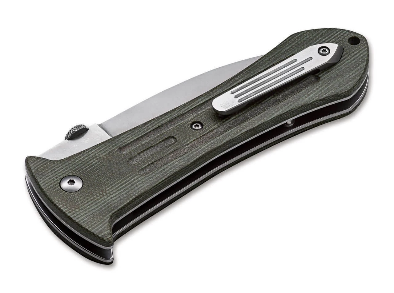 Das robuste Pocket Smatchet ist mit einer blattförmigen Spearpoint-Klinge aus VG-10 ausgestattet, die mit einem widerstandsfähigem Stonewash-Finish versehen ist. Der demontierbare Daumenpin auf dem Klingenrücken erlaubt das beidhändige Öffnen der Klinge, während ein stabiler Linerlock sie zuverlässig arretiert. Die dekorative Hohlkehle setzt sich auf den rutschfesten Griffschalen aus grünem Canvas Micarta fort, die dank der feinen Texturierung besonders sicher in der Hand liegen. Der stabile Clip (Tip-up/r) wird aus dem Vollen gefräst und ist ebenfalls mit den charakteristischen Vertiefungen des klassischen Smatchets versehen. Mit Fangriemenöse und hochwertigen Nylon-Etui zur Aufbewahrung.