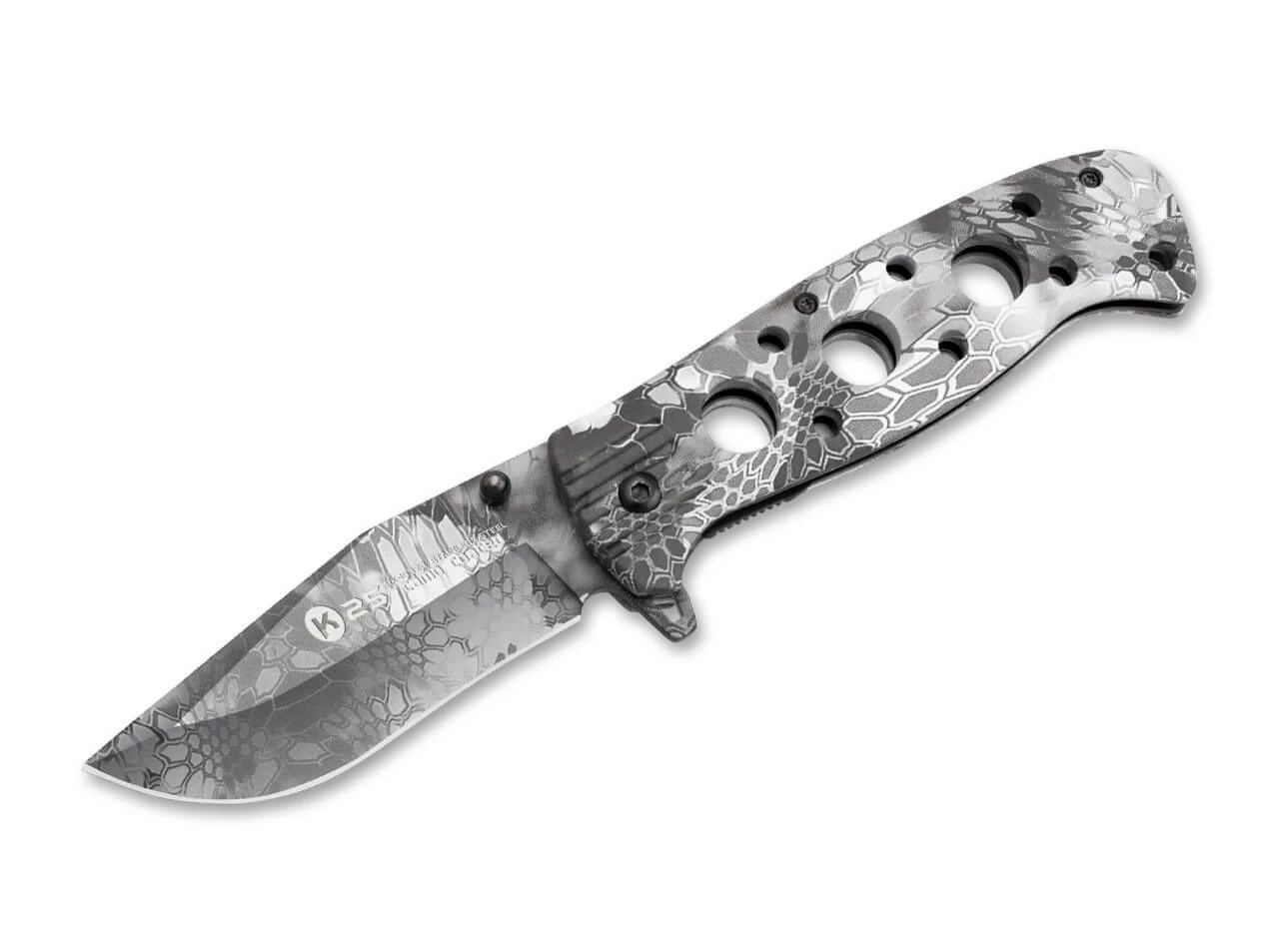 Der K25 Python Folder ist ein taktisches Einsatzmesser mit Python-Camo. Die spektakuläre Optik und die ausgezeichnete Handlage machen das K25 Python zu einem echten Hingucker. Die Klinge öffnet per Flipper oder Daumenknopf und verriegelt per Linerlock. Lieferung mit passendem Nylon-Gürteletui.
