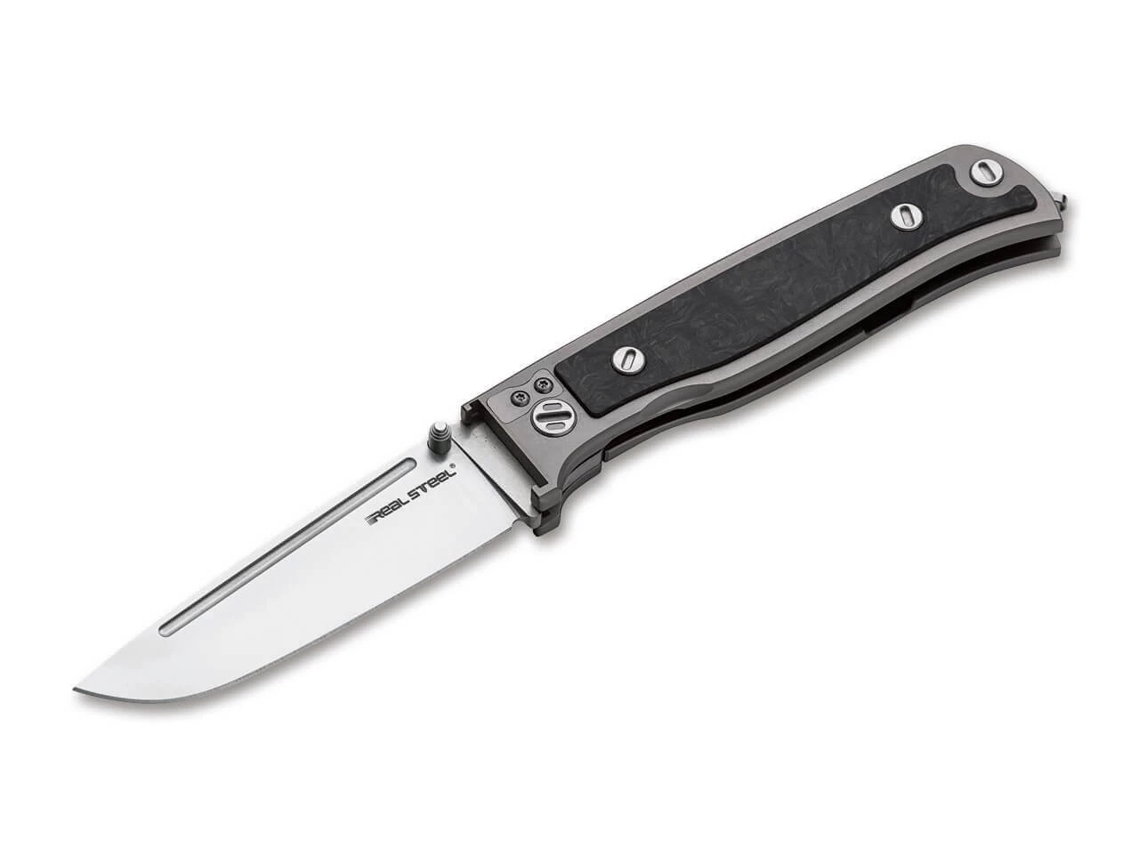 Das Relict von Real Steel ist ein eigenwilliges Jagdmesser, dass dank des ergonomischen Griffes sehr gut in der Hand liegt. Die schmale Klinge wird aus pulvermetallurgischem CPM-S-35VN gefertigt und lässt sich bequem per Daumenpin öffnen. Zusätzlich verfügt das moderne Messer von Ivan Braginets über zwei Auszieherkrallen für Schrotpatronen im Kaliber 12 und Kaliber 16, mit denen Hülsen und Pufferpatronen aus dem Patronenlager geschoben werden können. Das erleichtert die manuelle Entnahme von Patronen enorm und ist mittlerweile eigentlich nur noch bei einigen traditionellen osteuropäischen Messern anzutreffen. Außergewöhnlich ist auch die praktische Fangriemenöse, die nicht als einfaches Loch im Griff ausgeführt ist, sondern eher an einen Karabiner erinnert. Der Griff wird aus Titan gefertigt, die Einlagen bestehen aus wilder Kohlefaser. Dank der verbauten Schlitzschrauben lässt sich das Messer schnell demontieren und reinigen. Der Clip (Tip-Down) kann sowohl auf der Vorderseite als auch auf der Rückseite montiert werden.