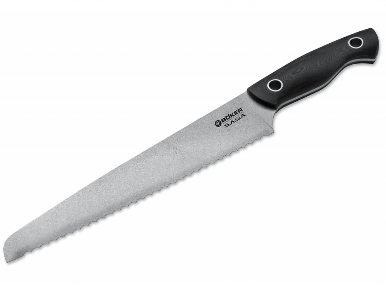 Die sanft geschwungenen Griffe werden aus unverwüstlichem schwarzen G10 gefertigt, das weder gegen Temperatur noch gegen Feuchtigkeit empfindlich ist. Schon bei der ersten Kontaktaufnahme mit der Messerserie Böker Saga wird die gelungene Ergonomie deutlich: Jeder Bogen, jeder Schwung in der Linie schmiegt sich an seine Stelle in der Hand und vermittelt eine absolute Kontrolle und ein überragendes Schneiderlebnis. Das schwalbenschwanzartig verbreiterte Griffende der größeren Modelle bringt zusätzliche Griffsicherheit. Die hohe Stabilität verdankt Böker Saga dem komplett durchgehenden Erl, der das Messer (in der gleichen Bauweise wie viele Jagdmesser) von der Klingenspitze bis zum Griffende durchzieht. Für eine optimale Schneidleistung steht nicht nur der komplette Flachschliff der Klinge mit Stonewash-Finish, sondern auch die Wahl von 440C als Klingenstahl, der hinsichtlich Schnitthaltigkeit und Korrosionsbeständigkeit übliche Küchenmesserstähle weit übertrifft. Dieses in einem speziellen Schleifverfahren erzeugte Oberflächenfinish zeichnet sich durch hervorragende Gleiteigenschaften im Schnittgut aus und fördert so die ohnehin ausgezeichnete Schneidleistung. Des weiteren ist die Mikrostruktur des Stonewash-Finish extrem unempfindlich gegen Kratzer, da diese sich optisch in der Struktur oft verlieren..Den besonderen Akzent setzen die großen Hohlnieten, die unverkennbar die Handschrift von Jesper Voxnæs tragen.