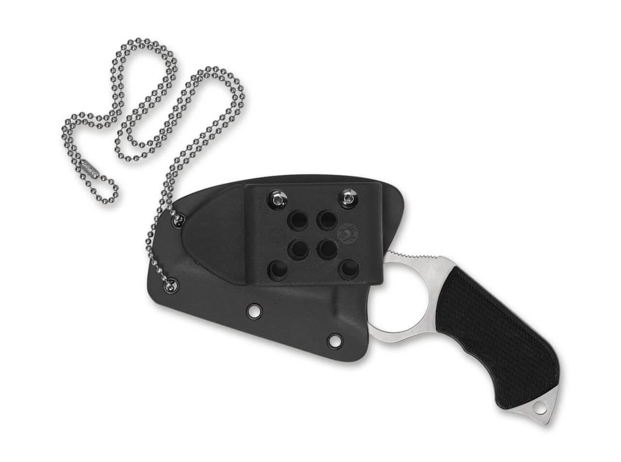 Das Swick 5 stammt aus der Feder von Spyderco Gründer Sal Glesser, welcher die bahnbrechenden Innovationen des französischen Messermachers Fred Perrin für dieses feststehende Messer aufgriff. Das Messer wurde speziell für die Selbstverteidigung konzipiert und verfügt über ein großes Loch für den Zeigefinger, womit eine noch sicherere Handhabung erfolgt. Die Wharncliffe-Klinge besteht aus LC-200N und läuft in den pistolenartigen Griff aus G10 formschön über. Mit Boltaron-Scheide und Fangriemenöse.