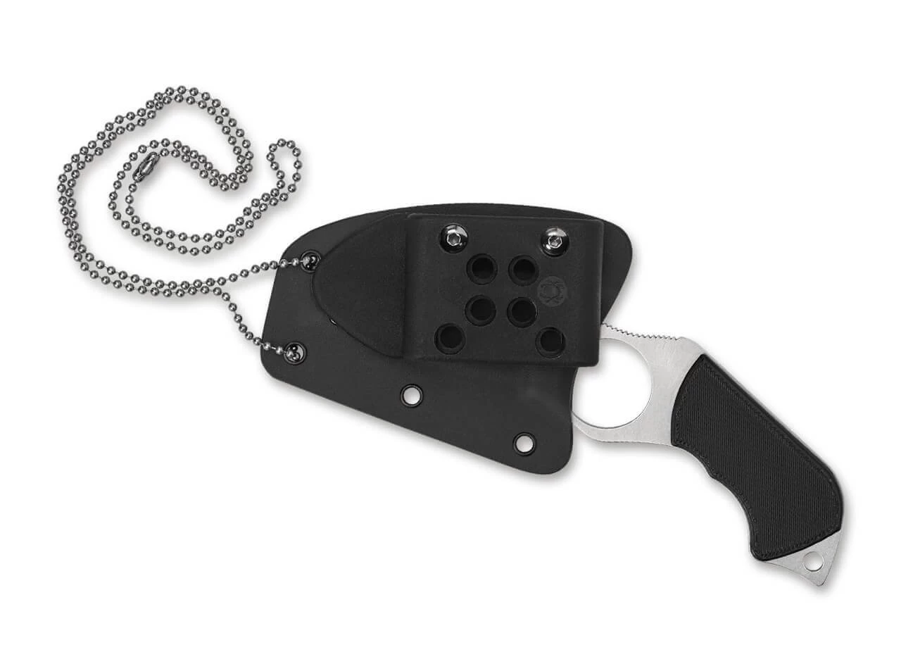 Das Swick 6 stammt aus der Feder von Spyderco Gründer Sal Glesser, welcher die bahnbrechenden Innovationen des französischen Messermachers Fred Perrin für dieses feststehende Messer aufgriff. Das Messer wurde speziell für die Selbstverteidigung konzipiert und verfügt über ein großes Loch für den Zeigefinger, womit eine noch sicherere Handhabung erfolgt. Die Wharncliffe-Klinge besteht aus LC-200N und läuft in den pistolenartigen Griff aus G10 formschön über. Mit Boltaron-Scheide und Fangriemenöse.