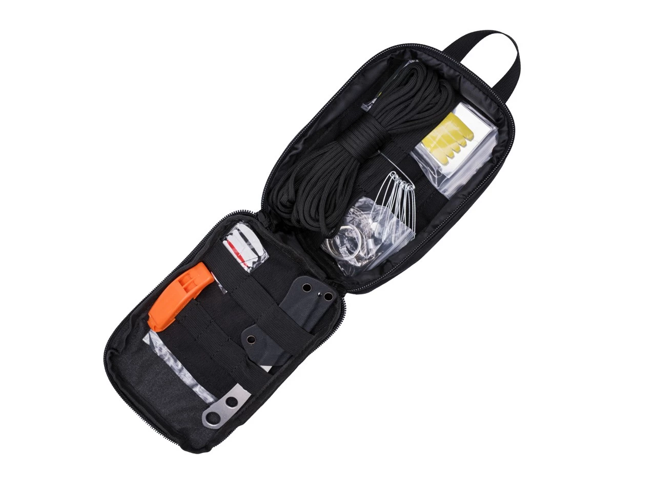 Mit dem praxistauglichen Survival Kit Elementary von Real Steel sind auch Einsteiger für alle Eventualitäten in der Wildnis gewappnet. Die hochwertige schwarze Tasche kann problemlos am Gürtel oder der Ausrüstung befestigt werden und beinhaltet neben dem Real Steel Marlin von Ostap Hel zahlreiche nützliche Ausrüstungsgegenstände: Einen Kompass, zehn Meter Paracord, einen Feuerstarter, eine Rettungsdecke, eine Signalpfeife, einen Signalspiegel, eine Laubsäge, vier Angelhaken, Angelschnur, Flickzeug und Sicherheitsnadeln. Insgesamt wiegt das Set dabei nur 400 Gramm. L x B x H: 14 cm x 19 cm x 5 cm