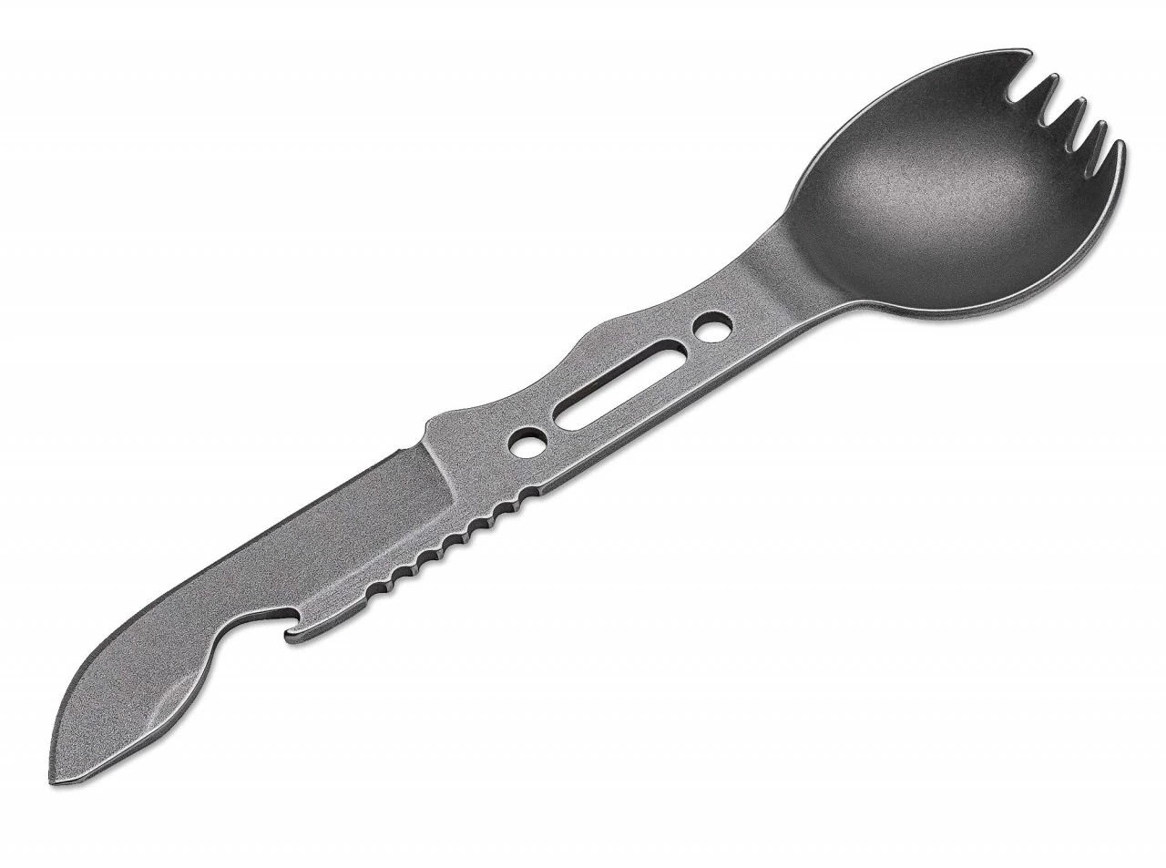 Leo Espinoza hat dieses multifunktionale Esswerkzeug als leichtgewichtiges und vielseitiges Werkzeug für Camper, Soldaten, Rucksacktouristen und Hiker entwickelt. Das F.O.R.K. IT bietet Gabel, eine vollwertige Messerklinge, Löffel und Kapselheber. Die Ganzstahlkonstruktion wird aus 1095 Kohlenstoffstahl gefertigt und mit einem Stonewash-Finish versehen. Lieferung mit Kydex-Scheide und Kugelkette. Die Scheide besitzt eine Aussparung, so dass der Kapselheber ohne Verletzungsgefahr genutzt werden kann.