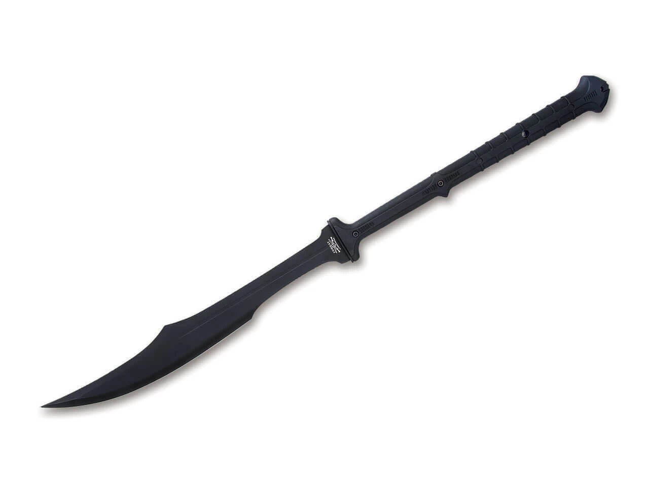 Wer sich wie ein spartanischer Feldherr auf dem letzten Feldzug fühlen möchte, kommt an dem Combat Commander Spartan von United Cutlery nicht vorbei. Das Schwert ist mit einer schwarz beschichteten Klinge aus 1065 Kohlenstoffstahl ausgestattet und wird von einer ausgeprägten Hohlkehle geziert. Gemäß dem historischen Vorbild verfügt das Schwert über einen langen Griff, so dass beim Gefecht den Gegner auf Distanz gehalten werden konnte. Der strukturierte Nylongriff verspricht sicheren Halt und wird durch einen Knauf am Griffende abgerundet. Mit Nylonscheide und Schultergurt.