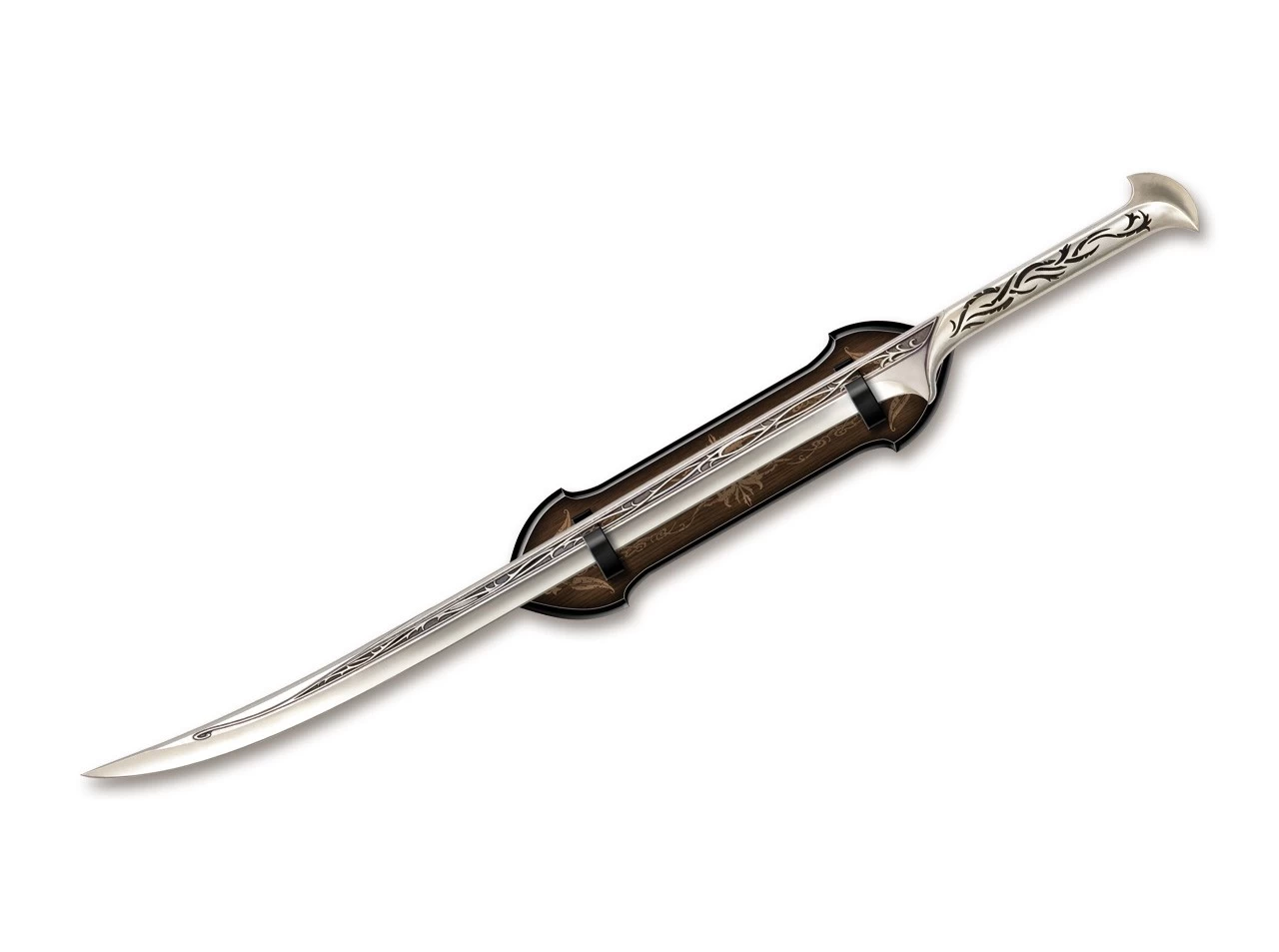Das Schwert des Elbenkönigs war eines von zwei Zwillingsschwertern, die von den besten Schmieden des Waldreichs für Thranduil gefertigt wurden. Die Klinge und der Griff des hochwertigen Replicas sind mit aufwendigen Verzierungen versehen. Die Klinge besteht aus Edelstahl, der Griff aus Metallguss mit authentischen Details, die genau auf die Filmrequisite abgestimmt sind. Mit einem hochwertigen Wand-Display mit einem grafischen Motiv von Thranduil.