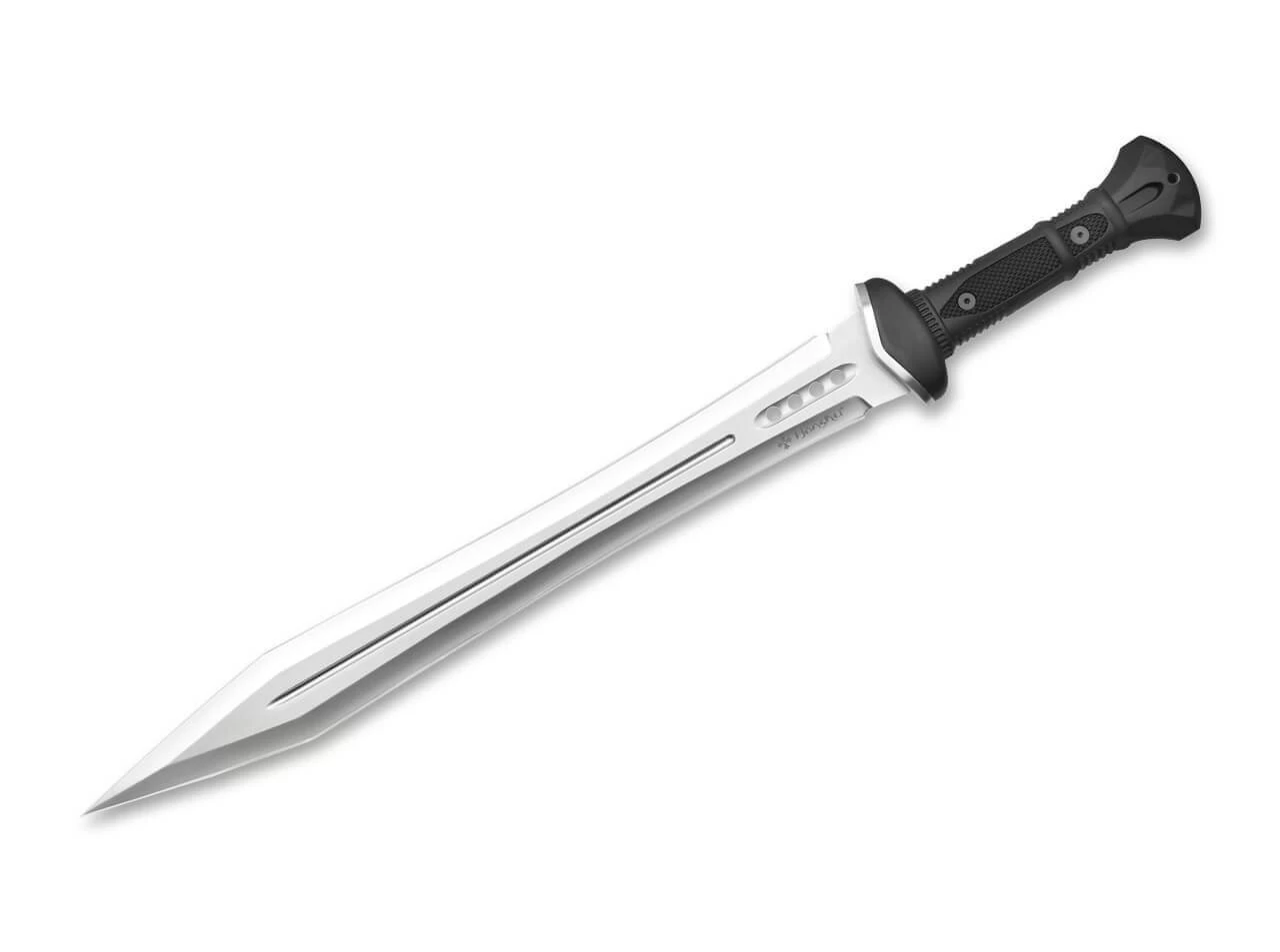 Nur die stärksten und tapfersten Gladiatoren ernteten nach ihren aufreibenden Kämpfen Ruhm und Respekt vom Imperator und Pöbel. Zu den Standardwaffen der antiken Berufskämpfer zählte einst der Gladius, das wohl bekannteste römische Schwert. United Cutlery lässt das alte Rom wiederaufleben und präsentiert das Honshu Gladiator Sword. Seine Klinge aus rostfreiem 7Cr13-Stahl ist mit einer Hohlkehle und gewichtsreduzierenden Durchbrüchen versehen. Der strukturierte und geriffelte Griff aus spritzgegossenem TPR liegt sicher in der Hand, während das typisch kurze Parierelement und der Knauf am Griffende das historische Profil abrunden. Lieferung mit hochwertiger Lederscheide.