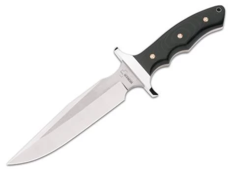 Moderne Interpretation der klassischen Vietnam-Bowies von Böker Plus. Die in zwei Richtungen satinierte Klinge (Two-Tone-Finish) hat eine beeindruckende Stärke von 6 mm und bietet durch den hervorragenden Stahl 440C eine ausgezeichnete Schnitthaltigkeit. Das Parierelement aus Edelstahl bietet den notwendigen Handschutz auch für robuste Anwendungen. Die aufwändig geschliffenen Micarta-Griffschalen sind mit einer roten Fiberlage unterlegt und bieten durch ihre ergonomische Kontur einen angenehmen und sicheren Griff. Die Befestigung der Griffschalen erfolgt über Mosaikpins, die auf Grund ihrer extrem aufwändigen Fertigung sonst nur bei Custom-Knives zu finden sind und dem Messer seine unverwechselbare Note geben. Ein echter Leckerbissen für Sammler. Durch das bewährte Konzept und die robuste Dimensionierung auch als Outdoormesser vielseitig einsetzbar. Inkl. Fangriemenloch. Lieferung mit schöner Sattel-Lederscheide.