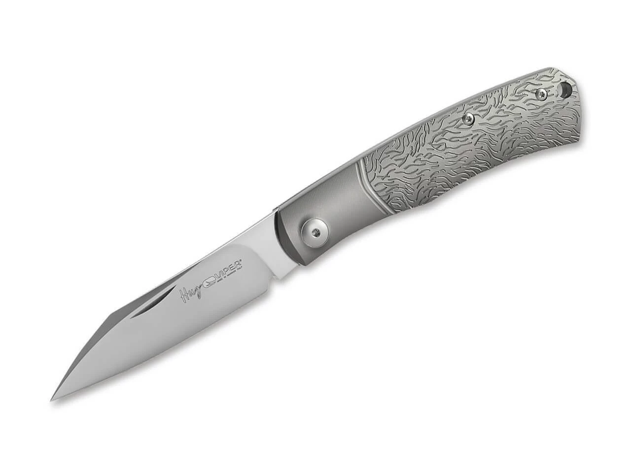 Einfach zum Liebhaben – das Viper Hug ist ein hochwertiges Slipjoint-Messer mit der richtigen Mischung aus modischem Chic und einer cleveren Materialwahl. Die Sheepfoot-Klinge aus M390 öffnet klassisch per Nagelhau und verriegelt nicht. Geborgenheit findet sie im an ein Wolfsfell errinnernden verzierten Griff aus Titan, der auch bei schwierigen Arbeiten sicher in der Hand liegt. Mit Fangriemenöse.
