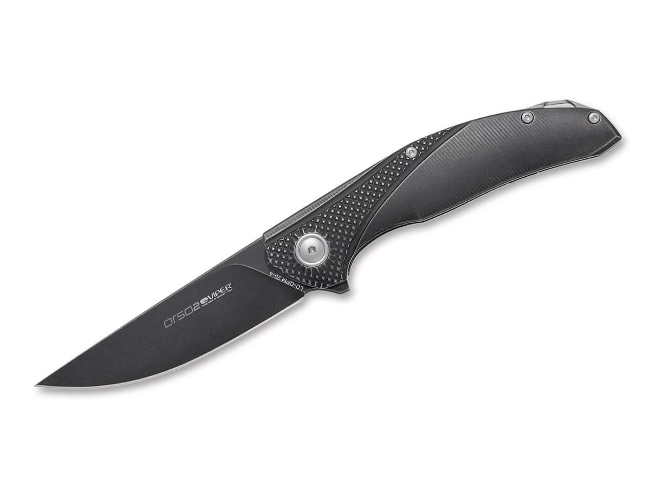 Jens Anso geht mit dem Viper Orso 2 in die nächste Runde und präsentiert ein grundsolides EDC Messer mit schwarzer LO QPM 4/20 Klinge, die dank Flipper bequem und einfach geöffnet wird. Der teiltexturierte schwarze Titangriff vermittelt eine sichere Handhabung und verriegelt die Klinge zuverlässig mit dem soliden Framelock. Spacer und der Clip setzen farbliche Akzente und runden das moderne Messer gelungen ab.