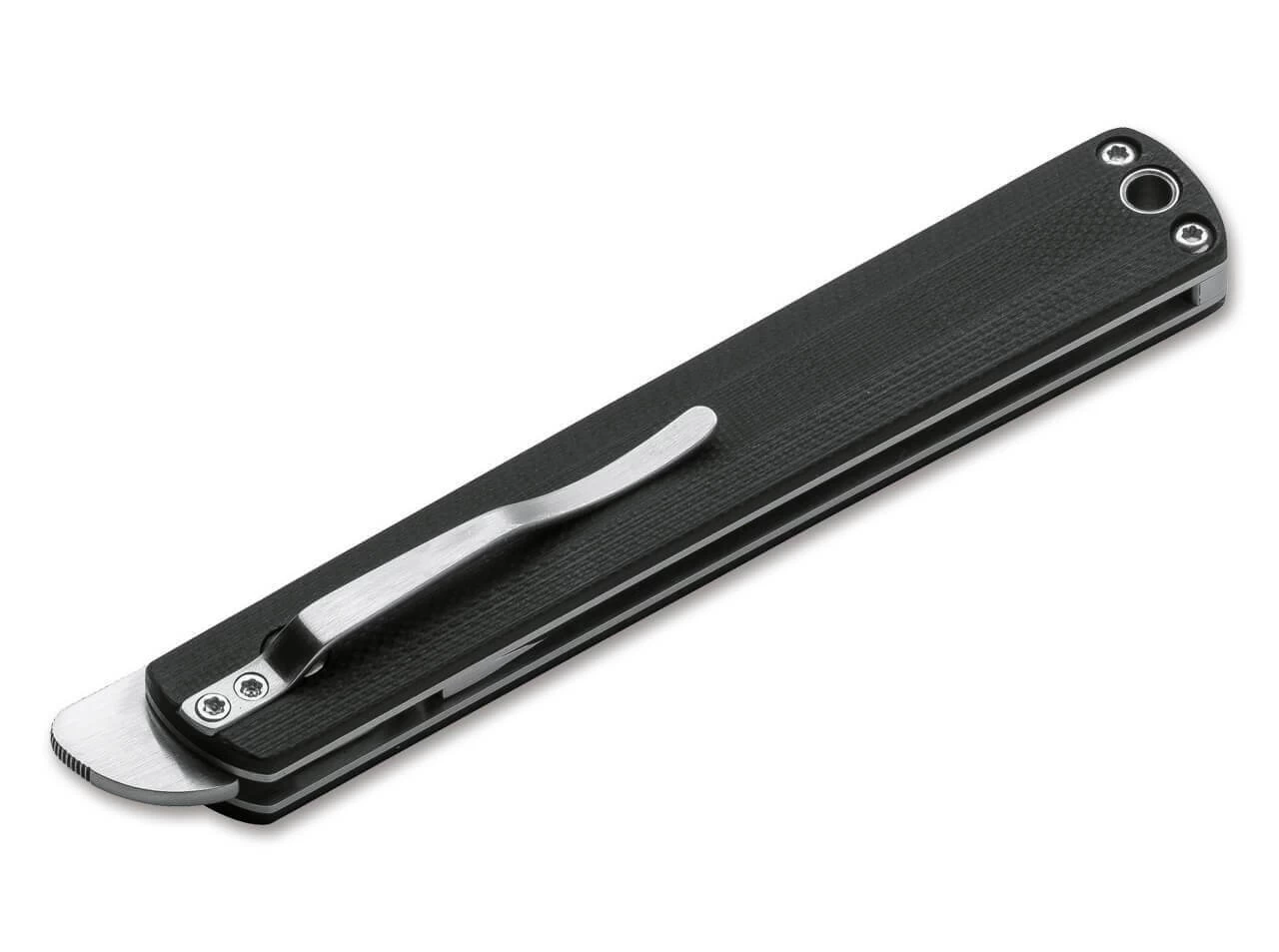 Die schlanke Bauweise und die leichtgewichtige Konstruktion des Böker Plus Wasabi ergeben zusammen mit dem geradlinigen Design und der klassisch-japanischen Klinge ein elegantes Messer für den Alltag. Die kugelgelagerte Klinge öffnet per Frontflipper und wird als Slipjoint von einem eigenen Detent Ball offengehalten. Für die Klinge kommt der bewährte 440C zum Einsatz. Griff mit Edelstahlplatinen und Beschalung aus schwarzem G10. Mit gefrästem Clip und hochwertigem Nylon-Etui zur Aufbewahrung.