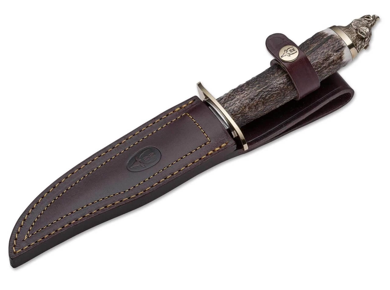 Der Höhepunkt der Muela Trophy-Serie bildet ohne Zweifel der Griffabschluss, der gleich einer Jagdtrophäe in Form eines detailliert ausgearbeiteten Wildschweinkopfes aus Messing gehalten ist. Das schön geschwungene Parierelement ist ebenfalls aus Messing gefertigt und bildet den vorderen Abschluss des aus einem Stück Hirschhorn gefertigten Griffes. Die satinierte Bowie-Klinge ist aus 4116–Stahl gefertigt und weist neben dem Namenszug noch eine Laserung des entsprechenden Tieres auf. Ein edles Sammlerstück, das aber auch als Gebrauchsmesser absolut überzeugen kann. Lieferung mit hochwertiger Lederscheide in edler Sammlerschatulle.