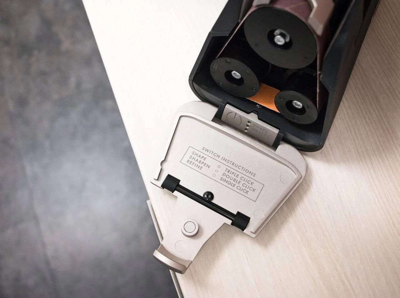 Das Premiummodell verfügt über drei verschiedene Schärfgeschwindigkeiten: Für das Formen einer Schneide, für das Schärfen und für den Feinabzug. Die vollautomatische Timersteuerung sorgt für optimal aufeinander abgestimmte Schärfintervalle. Der zusätzliche Ceramic-Schleifstab mit einer nutzbaren Länge von 20 Zentimetern weist eine grobe und eine feine Schleiffläche sowie einer Winkelführung auf und bietet die Möglichkeit des manuellen Auffrischens der Schärfe zwischendurch. Mit dem zusätzlichen Micro- Forge lässt sich eine glatte Schneide in Sekunden in einen Micro-Wellenschliff verwandeln. 220V Netzanschluss. Lieferung entgegen der Katalogangabe mit zwei Schleifbändern (Medium /P120).